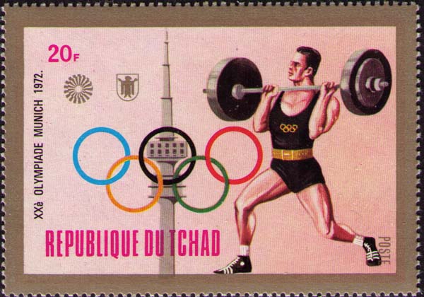 Мюнхенская телебашня, олимпийские кольца, герб Мюнхена, тяжелоатлет.
