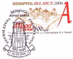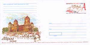 На марке и на конверте: Мирский замок в начале XVII века (реконструкция М. А. Ткачева).