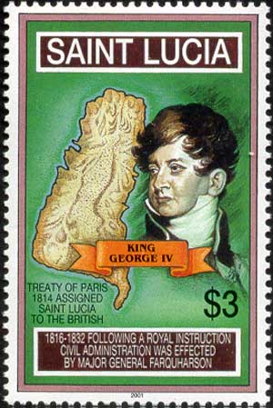Карта острова, портрет Георга IV (Томас Лоренс, 1815, Лондон, Национальная портретная галерея). Надпись: «Парижский договор 1814 закрепил Сент-Люсию за Британией. В 1816—1822 гражданскую администрацию возглавлял генерал-майор Фароу Харсон, следовавший королевским инструкциям».