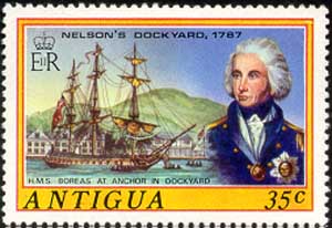 Док Нельсона в 1797 (ошибка в дате — Нельсон покинул док на 12 лет раньше). HMS «Boreas» на якоре в доке, «Горацио, виконт Нельсон, вице-адмирал» (Лемюэль Фрэнсис Аббот, 1797, Гринвич, Национальный морской музей, фрагмент).