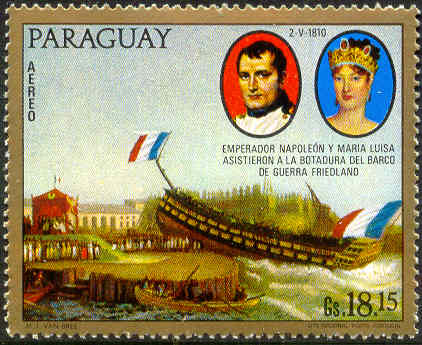 «Император Наполеон и Мария-Луиза наблюдают в Антверпене спуск судна «Fridland». 2 мая 1810» (Матье Игнас ван Бре, 1-я четверть XIX века, Версаль, Музей дворца, фрагмент); портрет Наполеона работы Давида (1812, Вашингтон, Национальная галерея, фрагмент); портрет Марии-Луизы работы Жерара (фрагмент).