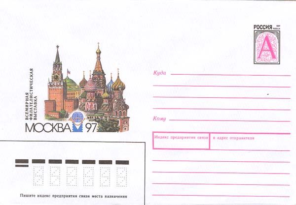 Всемирная филателистическая выставка «Москва’97». Спасская башня Кремля и Покровский собор.