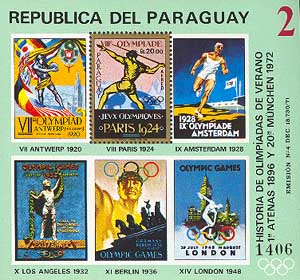 Марка издана в блоке, на поле которого плакаты других Олимпиад, в том числе Олимпийских игр 1936 в Берлине с изображением Бранденбургских ворот.