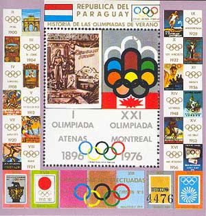 Марка издана в блоке, на поле которого плакаты разных Олимпийских игр, в том числе Олимпиады 1900 в Париже с изображением арки Карусель и Олимпиады 1936 в Берлине с изображением Бранденбургских ворот.