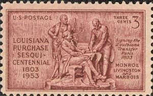 Роберт Р. Ливингстон, Джеймс Монро и Франсуа Барбе-Марбуа подписывают договор о продаже Луизианы в Париже (бронзовый барельеф Карла Биттера с пьедестала Монумента продажи Луизианы, Сент-Луис, 1904).