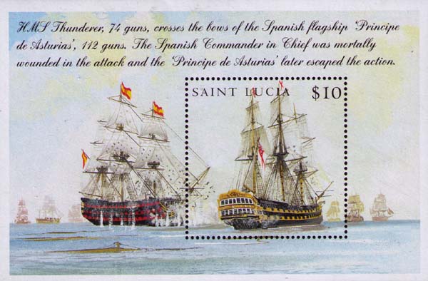 Британский 74-пушечный корабль HMS «Thunderer» маневрирует под огнем испанского 112-пушечного корабля «Principe de Austurias».
