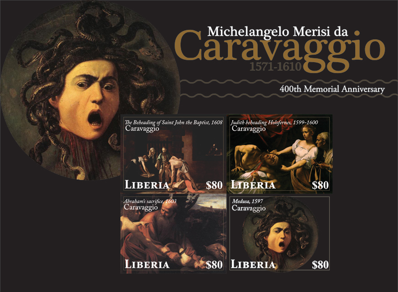 Марки изданы в малом листе. На поле листа — «Медуза» (Микеланджело Караваджо, около 1598, Флоренция, Галерея Уффици).