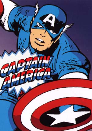 На марке и на карточке: Капитан Америка — герой комиксов.