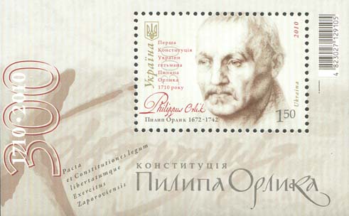 Марка издана в блоке. На поле блока — фрагмент текста Конституции.