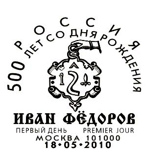 Москва. Первый день марки М1643. Печатный знак Ивана Фёдорова: рука, держащая щит с буквами «И» «Ф»; между ними изогнутая полоса в виде латинской «S», над нею — деталь, напоминающая наконечник стрелы. Исследователи расшифровывают эти стилизованные изображения как изгиб реки (в соответствии с древним изречением «книги — суть реки, наполняющие вселенную») и угольник — инструмент, использовавшийся при наборе букв. Однако Иван Фёдоров такой знак стал использовать для обозначения своих изданий позже, уже обосновавшись во Львове; после того, как был сожжён московский печатный двор в 1565 году Иван Фёдоров вместе со своим помощником Петром Мстиславцем вынуждены были бежать из Москвы.