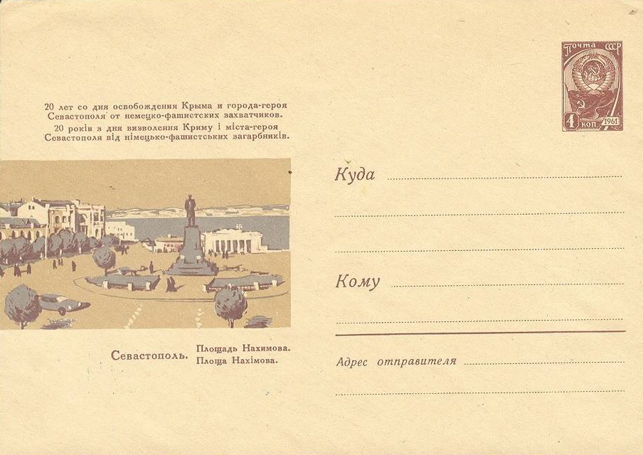 Площадь Нахимова в Севастополе. В центре — памятник Павлу Нахимову (скульптор Николай Томский, 1959). К 20-летию со дня освобождения Севастополя от немецко-фашистских захватчиков.