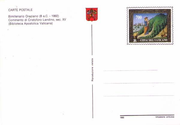 На марке: изображение Горация на горе Геликон из рукописи «Ватиканского Латинского кодекса 3173» (XV век, Ватикан, Апостольская библиотека).