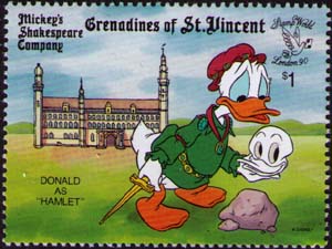 Philatelia.Ru / Художественная литература / Марки / Дональд в роли ГамлетаСерия: Филателистическая выставка «London’90». Сцены из пьес Шекспира, разыгрываемые героями мультфильмов Уолта Диснея