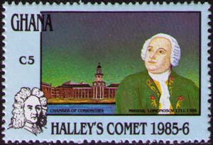 Портреты Ломоносова (гравюра М. Шрейера по рисунку Х. Г. Шульца, конец XVIII века, Санкт-Петербург, Государственный Эрмитаж) и Галлея, здание Кунсткамеры в Санкт-Петербурге (Музея антропологии и этнографии им. Петра Великого РАН), в башне которой расположен музей Ломоносова.