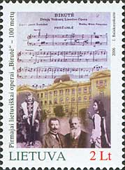 Партитура первой оперы на литовском языке «Бирута», премьера которой состоялась в ратуше Вильнюса 6 ноября 1906; портреты композитора Микаса Петраускаса и драматурга Габриелюса Ландсбергиса-Жемкальниса; персонажи оперы; здание ратуши Вильнюса (сегодня — Литовская национальная филармония).