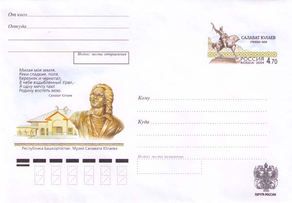 На конверте: бюст Салавата Юлаева, здание музея Салавата Юлаева в Селе Малояз (Республика Башкортостан), строки из стихотворения Салавата Юлаева.