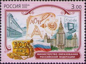 200 лет Министерству образования Российской Федерации. Здание МГУ на Воробьевых горах в Москве (перед зданием — памятник Ломоносову (скульптор Николай Томский, архитектор Л. В. Руднев, 1954), здание бывшего Министерства на улице Зодчего Росси в Санкт-Петербурге и символы знаний.