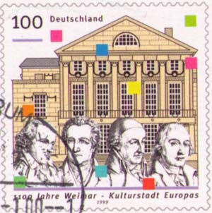 На марке: Национальный немецкий театр в Веймаре, портреты писателей — Шиллера, Гете, Виланда и Гердера.