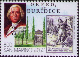 Портрет композитора Кристофа Валлибальда Глюка, сцена из оперы «Орфей и Эвридика», созданной по либретто Раньери да Кальцабиджи. Из многочисленных вариантов легенды об Орфее либреттист выбрал тот, что изложен в «Георгиках» Вергилия.