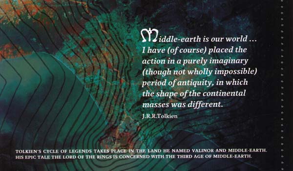 На страницах буклета — портрет писателя, обложки первых изданий «Хоббита» и «Властелина колец», множество цитат из книг и писем Толкина и рукопись рунического алфавита, составленного писателем. Кстати, на задней обложке буклета напечатаны условия конкурса, в котором надо было прочитать написанную руническими знаками цитату из произведения Толкина. Первым призом были два билета на круиз по норвежским фьордам, так похожим на пейзажи Средиземья.