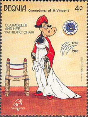 Philatelia.Ru / Французская революция / Марки / «Кресло патриота»Серия: 200-летие Французской революции. Международная филателистическая выставка «PHILEXFRANCE’89». Герои мультфильмов Уолта Диснея в ролях персонажей революции