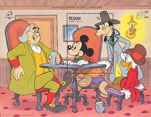 Philatelia.Ru / Французская революция / Марки / Философы в кафе «La Procope»Серия: 200-летие Французской революции. Международная филателистическая выставка «PHILEXFRANCE’89». Герои мультфильмов Уолта Диснея в ролях персонажей революции