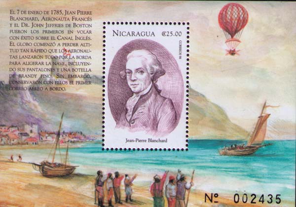 Марка издана в блоке. На поле блока — перелет Бланшара и Джеффриса через Ла-Манш, 1785.